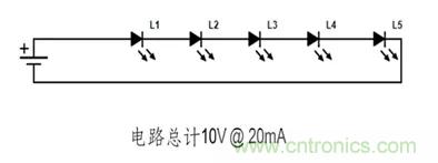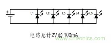 【導讀】LED電路的接線方式決定了電路正常工作所需的電壓和電流。下方兩條電路使用了五個160-1445-1-ND LED。單個LED電壓2V 20mA。如您所見, 每條電路所需的工作電壓和電流之間存在顯著差異。