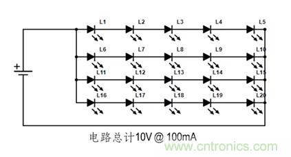一般說來, 大多數LED照明都使用串並聯組合。如下圖: