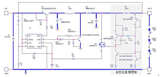 除了單純的降壓或升壓拓撲結構,在某些環境下,也需要降壓-升壓拓撲結構,如從標準電源輸入端驅動LED串;此外,在輸入電壓和LED負載電壓交疊的場合中使用這種拓撲結構也很常見。而NCP3065也能夠配置為降壓-升壓控製器。這種架構需要2個電源開關。雖然NCP3065本身也包含1個電源開關,但我們可以使用1個低VCEsat PNP/NPNduiguanlaihuodegenggaozhuanhuanxiaolv。zheshiyizhongkekuozhandefangan,zhengliuqihedianyuankaiguandounenggougenjujutideshuruheshuchudianyayijidianliudianpinglaitiaozheng。zhideyitideshi,zhuruNSS40500UW3這樣的低VCEsat晶體管采用小巧的2×2 mm封裝,提供極佳的性能。