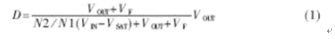 其基本工作原理為:當開關管Q1導通時(TON),電流流過變壓器T1的初級線圈N1,變壓器將能量以磁場的形式儲存起來,由於初、次級圈相位不同,所以當電流流過初級線圈時,次級線圈N2中沒有電流流過。當Q1截止時(TOFF),消失的磁場使初、次級線圈中電壓極性反轉,整流二極管VD導通,電流通過VD流向負載,變壓器的能量釋放,提供負載電壓、電流。控製器占空比為: