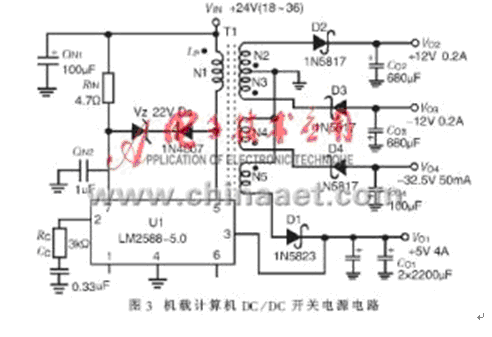 U1為控製器LM2588-5.0。脈衝變壓器T1共有五個繞組:N1為初級繞組,N2、N3、N4、N5為次級繞組,分別對應輸出+、-、-以及+5V@4A,且N2、N3圈數相同。