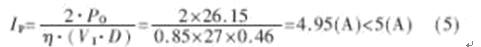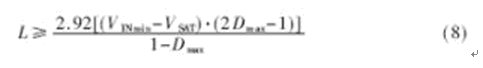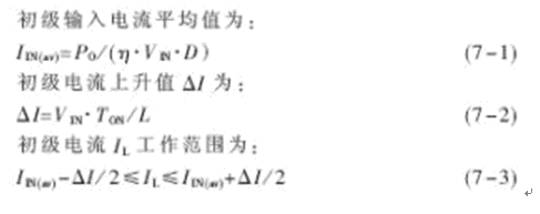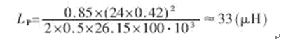 設PWM控製最大占空比Dmax=42%,如果初級繞組的電感量設計得大,則流過功率開關管和輸出濾波電容的電流峰值小,但由於電流上升斜率小,電路抗幹擾能力差且功率開關管開通電流大;電感量小時,電流脈動大,衝擊電流大。因此設計電感電流工作在連續工作狀態,輕負載時取額定功率的一半,由(2)式可知: