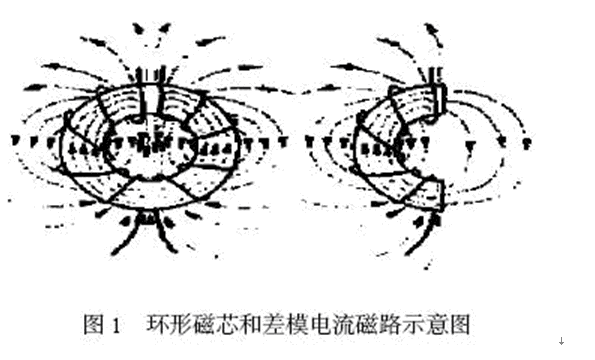 磁(ci)芯(xin)的(de)作(zuo)用(yong)就(jiu)好(hao)像(xiang)它(ta)在(zai)線(xian)圈(quan)繞(rao)組(zu)的(de)間(jian)隙(xi)處(chu)裂(lie)為(wei)兩(liang)半(ban)時(shi)所(suo)表(biao)現(xian)出(chu)來(lai)的(de)效(xiao)果(guo)一(yi)樣(yang)。每(mei)個(ge)繞(rao)組(zu)在(zai)環(huan)形(xing)線(xian)圈(quan)一(yi)半(ban)的(de)區(qu)域(yu)內(nei)產(chan)生(sheng)磁(ci)場(chang),意(yi)指(zhi)穿(chuan)過(guo)空(kong)氣(qi)的(de)磁(ci)場(chang)必(bi)定(ding)會(hui)形(xing)成(cheng)自(zi)封(feng)閉(bi)回(hui)路(lu)。圖(tu)1是環形磁芯和差模電流磁路的示意圖。