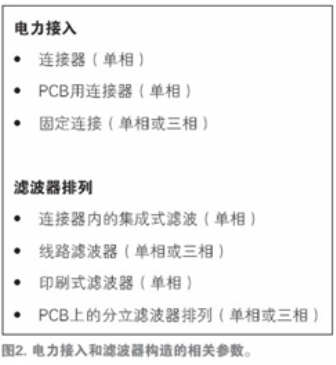在電力接入和濾波器構造這兩方麵之間(圖2),關於濾波器的構造方式(例如與內置濾波器的固定連接、帶有集成式線路濾波器的電力進入模塊、PCB上與分立濾波器的固定連接等),大約有10個有意義的組合。
