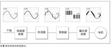 對於電力電子產品,特別是在驅動器領域,除了線路濾波以外,其它保護因素也會起到作用。圖3所示為某驅動係統的一種構造方式,不同的抑製元件在其中共同產生作用(定性的電壓特性)。