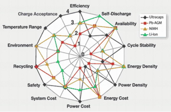 Li離子、NiMH等(deng)新(xin)型(xing)電(dian)池(chi)可(ke)以(yi)提(ti)供(gong)一(yi)個(ge)可(ke)靠(kao)的(de)能(neng)量(liang)儲(chu)存(cun)方(fang)案(an),並(bing)且(qie)已(yi)經(jing)在(zai)很(hen)多(duo)領(ling)域(yu)中(zhong)廣(guang)泛(fan)使(shi)用(yong)。眾(zhong)所(suo)周(zhou)知(zhi),化(hua)學(xue)電(dian)池(chi)是(shi)通(tong)過(guo)電(dian)化(hua)學(xue)反(fan)應(ying),產(chan)生(sheng)法(fa)拉(la)第(di)電(dian)荷(he)轉(zhuan)移(yi)來(lai)儲(chu)存(cun)電(dian)荷(he)的(de),使(shi)用(yong)壽(shou)命(ming)較(jiao)短(duan),並(bing)且(qie)受(shou)溫(wen)度(du)影(ying)響(xiang)較(jiao)大(da),這(zhe)也(ye)同(tong)樣(yang)是(shi)采(cai)用(yong)鉛(qian)酸(suan)電(dian)池(chi)(蓄電池)的設計者所麵臨的困難。同時,大電流會直接影響這些電池的壽命,因此,對於要求長壽命、高可靠性的某些應用,這些基於化學反應的電池就顯出種種不足。