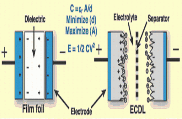 早(zao)期(qi)的(de)超(chao)級(ji)電(dian)容(rong)器(qi)的(de)電(dian)極(ji)采(cai)用(yong)碳(tan),碳(tan)電(dian)極(ji)材(cai)料(liao)的(de)表(biao)麵(mian)積(ji)很(hen)大(da),電(dian)容(rong)的(de)大(da)小(xiao)取(qu)決(jue)於(yu)表(biao)麵(mian)積(ji)和(he)電(dian)極(ji)的(de)距(ju)離(li),這(zhe)種(zhong)碳(tan)電(dian)極(ji)的(de)大(da)表(biao)麵(mian)積(ji)再(zai)加(jia)上(shang)很(hen)小(xiao)的(de)電(dian)極(ji)距(ju)離(li),使(shi)超(chao)級(ji)電(dian)容(rong)器(qi)的(de)容(rong)值(zhi)可(ke)以(yi)非(fei)常(chang)大(da),大(da)多(duo)數(shu)超(chao)級(ji)電(dian)容(rong)器(qi)可(ke)以(yi)做(zuo)到(dao)法(fa)拉(la)級(ji),一(yi)般(ban)容(rong)值(zhi)範(fan)圍(wei)為(wei)1~5000F。
