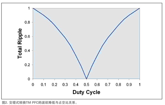 如果交錯式轉換電源轉換器以50%的占空比工作,第一相的輸入波紋完全抑製了第二相的輸入波紋,從而產生無開關成分的輸入電流,且不會產生EMI。在占空比偏離50%時,抑製作用降低,殘餘波紋增大(參見圖2)。然而,波紋抑製多數的優點還是實現了。