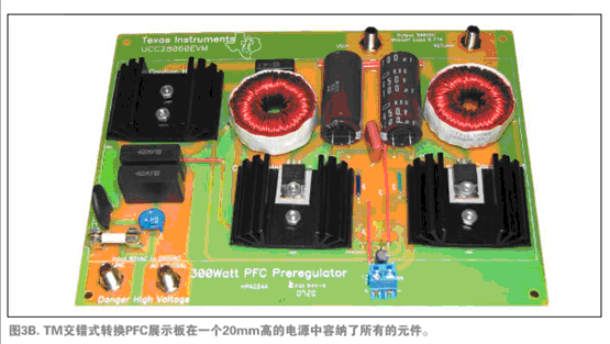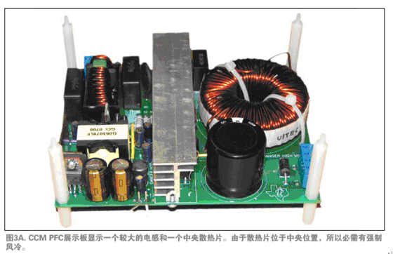 圖3A與3B顯示了兩個原型電源。圖3A是一個有正向轉換器進行輸出穩壓的單相CCM PFC及一個EMI濾波器。在此電源中,電感、大型濾波電容及散熱片體積均較大,位於中央位置,使電源體積略為龐大。圖3B是一個兩相交錯式轉換TM PFC。交錯式轉換電源非常薄,因為電感體積縮小了,輸出濾波器電容尺寸及布局均為散熱而考慮。如果布局采用同樣的規則,交錯式轉換TM PFC也可以縮小體積。