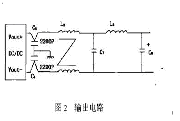二次電源的輸出高頻噪聲(表現為紋波)可能向空間輻射成為輻射噪聲,過大時造成作為負載的電子設備出現故障。為此,二次直流電源的輸出應包括平滑電路和EMI濾波電路。電路圖如圖2所示。