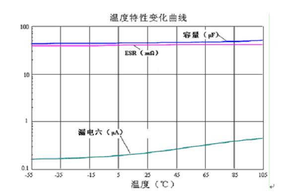 4. 溫度特性穩定,如圖1所示在-55~+105℃工作溫度範圍內,容量、ESR變化幅度小。