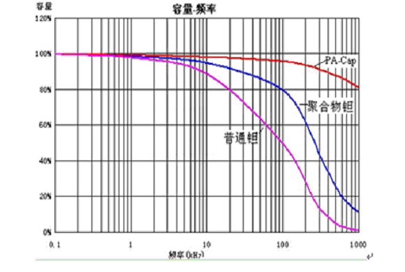 圖2. PA-Cap、聚合物鉭電容、普通鉭電容的容量隨頻率變化