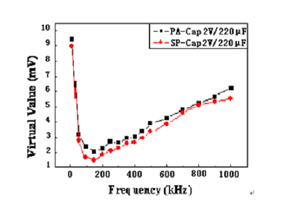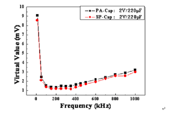 如上麵的濾波效果顯示,當開關電源頻率在300KHz左右時,同種規格的PA-Cap的輸出均方根與SP-Cap的很接近,所以PA-Cap濾波效果基本接近於SP-Cap。由於具有低的ESR、允許的紋波電流大,所以PA-Cap也是DC/DC轉換器或開關電源輸出電容的優選電容之一。