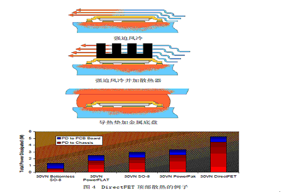 DirectFET封裝的頂部金屬漏極連接為芯片的結和頂部封裝之間提供了一條較低的熱阻抗路徑使結到殼的熱阻隻有3°C/W 。這就使得器件的散熱方法與以往有很大不同,可以用強迫風冷或導熱的填充介質將熱傳到一個適當接地的散熱器上。圖4舉例說明了這些概念。