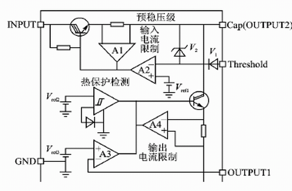 從圖1中還可以看出,VB409還有輸入、輸出電流的限製和熱保護功能。其作用在於:一方麵當輸出短路時限製電流的輸出;另一方麵當過載時關斷芯片。