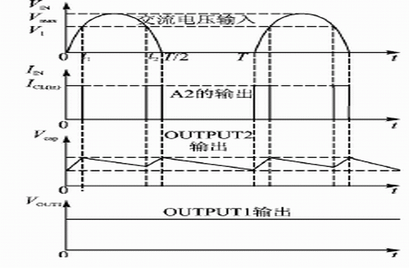 VB409采(cai)取(qu)的(de)是(shi)導(dao)通(tong)角(jiao)技(ji)術(shu),即(ji)在(zai)交(jiao)流(liu)電(dian)的(de)一(yi)個(ge)周(zhou)期(qi)中(zhong),根(gen)據(ju)負(fu)載(zai)的(de)電(dian)流(liu)大(da)小(xiao),自(zi)動(dong)調(tiao)整(zheng)每(mei)個(ge)周(zhou)期(qi)的(de)導(dao)通(tong)時(shi)間(jian)。也(ye)就(jiu)是(shi)說(shuo),隻(zhi)在(zai)每(mei)個(ge)正(zheng)周(zhou)期(qi)的(de)低(di)壓(ya)部(bu)分(fen),從(cong)電(dian)源(yuan)吸(xi)收(shou)電(dian)能(neng),因(yin)此(ci)極(ji)大(da)地(di)降(jiang)低(di)了(le)功(gong)耗(hao),電(dian)流(liu)輸(shu)出(chu)能(neng)力(li)是(shi)線(xian)性(xing)電(dian)源(yuan)的(de)3倍。其工作波形如圖2所示。