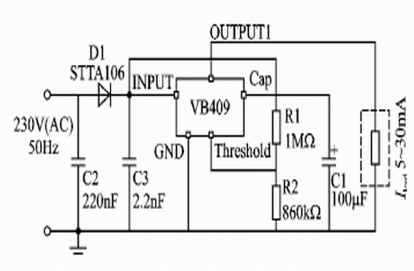 由於沒有變壓器,因此就失去了電流的絕緣,所以采用VB409作為供電電源,要用在對電流絕緣沒有要求的場合,例如洗衣機、中央供熱、功率計量等。對於需要電流絕緣的場合,需在供電輸入端加一個1∶1的小型隔離變壓器,因為輸入功率低,所以變壓器的尺寸可以做得比較小,同時變壓器的輸出還可以使用電阻分壓後再輸入到VB409中。