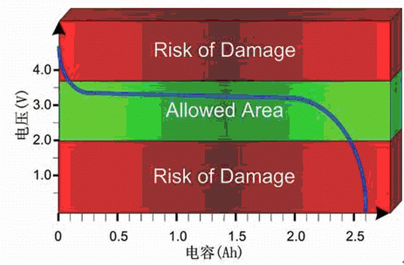 一旦電壓超出允許範圍,鋰電池很容易被損壞(見圖1)。如果超出電壓的上限和下限(例如,nanophosphate鋰電池的電壓上限和下限分別為3.6V和2V),電dian池chi就jiu可ke能neng會hui受shou到dao不bu可ke逆ni的de損sun壞huai,至zhi少shao也ye會hui增zeng加jia電dian池chi的de自zi放fang電dian率lv。在zai相xiang當dang寬kuan的de荷he電dian狀zhuang態tai範fan圍wei內nei,輸shu出chu電dian壓ya可ke以yi保bao持chi穩wen定ding,因yin此ci正zheng常chang情qing況kuang下xia超chao出chu安an全quan範fan圍wei的de可ke能neng性xing比bi較jiao小xiao。但dan是shi,在zai接jie近jin安an全quan範fan圍wei上shang限xian和he下xia限xian的de區qu域yu,變bian化hua曲qu線xian非fei常chang陡dou峭qiao。作zuo為wei預yu防fang措cuo施shi,仔zai細xi監jian測ce電dian壓ya水shui平ping非fei常chang必bi要yao。