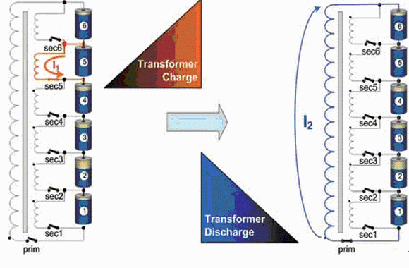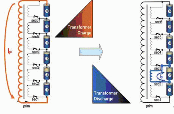 閉合主繞組開關,電池組向變壓器充電。然後斷開主繞組開關,閉合相應的次繞組開關(本例中為2號次繞組開關),變壓器儲存的能量轉移到指定的電池上。