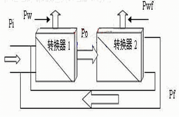 第二種工作模式是引入能量反饋的情況下,能量轉換如圖3所示:轉換器1為需要例行使用的電源轉換器,轉換器2為用於能量反饋的轉換器,Pi為係統外給轉換器1的輸入能量,Pw為轉換器1轉換過程中的消耗能量,Po為例行使用電源轉換器1正常應輸出的能量,同時也是轉換器2的輸入能量;Pwf為用於能量反饋的轉換器2轉換過程中的消耗能量,Pf為轉換器2反饋給電源轉換器1的能量。
