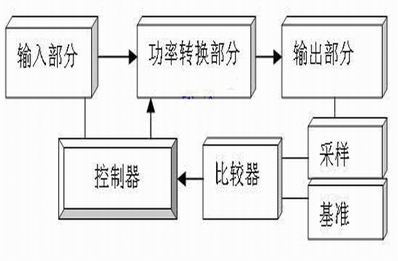 從以上能量反饋係統工作分析可知,能量反饋部分為係統穩定工作提供必要的保證, 能量反饋部分組成可由圖5所示,主要包括:輸入部分、功率轉換部分、輸出部分、采樣、基準、比較器和控製器七個組成部分。