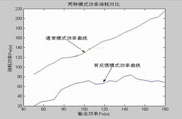 結果分析:在通常工作模式情況下,曲線的波動是由於電能轉換器的轉換效率影響造成的,由前麵原理分析可知消耗功率為Pi=Po+Pw, 如果轉換效率為 ,則Pi=Po/η,轉換效率η通常隨著輸出功率的變化有一定的波動,所以曲線的波動符合理論分析;在有反饋的工作模式情況下,由前麵原理分析部分得係統的消耗功率為Pi=Pw+Pwf,分別設轉換器1的轉換效率為η1,反饋部分的轉換效率為η2,則係統的消耗功率為: