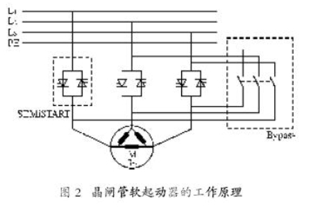 為了控製起動階段施加在感應電機上的電壓,需要一個軟起動裝置(軟起動器)。在軟起動器中,半導體(晶閘管)被用於電壓的控製。其工作原理如圖2所示。
