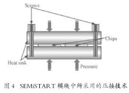 SEMiSTART模塊中,用於芯片的連接技術基於壓接技術,兩個晶閘管芯片反並聯連接並被壓在兩個散熱器之間。