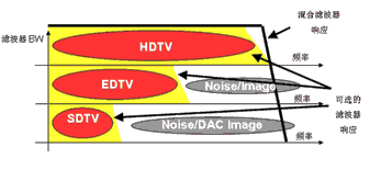 上述情況對接受 Y’P’BP’R或G’B’R’分量視頻信號的接收機係統來說尤為重要。舉例來說,如果我們用固定的35MHz無源濾波器為顯示器提供所有分量信號,那麼在輸入端采用480i或576i SD分量信號怎麼辦呢?一般的 DAC 對這種信號的采樣頻率為27MHz。如果DAC不帶重構濾波器的話,那麼27MHz基本頻率兩側出現的圖像將直接通過顯示器的無源35MHz濾波器,造成圖像未經衰減,因此顯示器上顯示的畫質通常非常差。