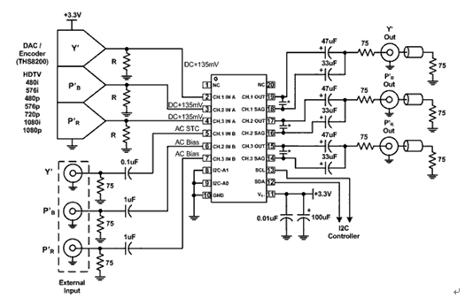 AC偏置非常簡單。THS73x3有兩個電阻,其可在電源和接地間創建分壓器。該模式的輸入阻抗為20kΩ,因此所用的電容應足夠大,以盡可能減小傾斜或下垂問題。該模式最適用於Chroma或色差信號,也可用於Luma信號、G’B’R’信號或計算機的R’G’B’信號。由於信號為AC耦合,且DC偏置點與平均信號電平有差異,因此對於帶5V電源同步信息的信號而言,我們最好用AC偏置模式,以確保沒有剪切問題發生。