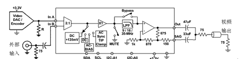 如果係統設計中已經采用了THS7303或THS7313 6dB增益放大器,並采用了參考接地的DAC或編碼器驅動,那麼DC輸入模式會很理想。問題在於,DAC生成的電壓有多低?如果同步信號(通常這是視頻信號中電壓最低的)電壓低於50mV,那麼6dB放大器的輸出就應生成低於100mV的電壓,由於CMOS和雙極放大器都存在晶體管飽和方麵的限製,因此這對任何放大器來說都是很難做到的。
