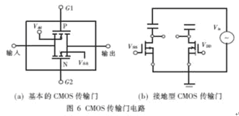 基本的CMOS傳輸門如圖6(a)所示。當傳輸門導通時,在輸入與輸出之間呈現低電阻,它允許電流向兩個方向中的任一方向流經此門。此時,輸入線的電壓必須比N溝器件的襯底電壓(VSS)為正,比P溝器件的襯底電壓(VDD)為負。這導致了傳統的CMOS傳輸門和以此為基礎構成的CMOS模擬開關難以適應大信號的傳輸[4~5]。