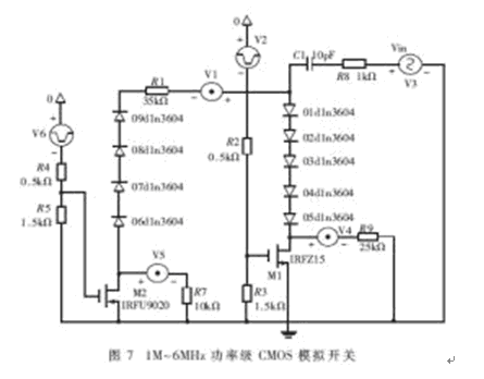 對約束VDD≥Vin≥VSS作深入分析可知,Vin之所以取值有限,根本原因在於其與V柵-襯底的關聯。使V柵-襯底獨立,避免Vin、Vout的影響,反過來將讓Vin輕鬆擺脫束縛。為此,本節設計了接地形CMOS傳輸門。原理電路如圖6(b)所示,具體的1M~6MHz高頻、功率級模擬開關電路見圖7。