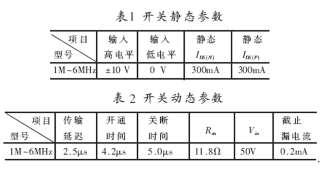 表1、2給出了開關的實測指標。圖8給出了開關瞬時通斷仿真曲線。