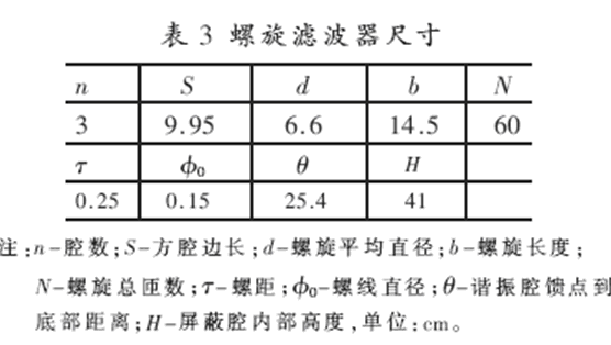 調頻範圍1.5M~3MHz;通帶中心插耗A0≤3dB;25dB帶寬△f25dB≥25kHz; 終端負載RS=RL=50Ω;傳輸功率P=100W。采用等元型螺旋濾波器設計法[6]確定的方腔螺旋腔濾波器腔數及尺寸見表3,測試結果見圖9、10及表4。