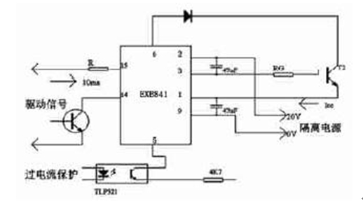 EXB84 係列為日本富士公司推出的IGBT專用芯片,能驅動高達300A/1200V 的IGBT。它具有隔離強度高、反應速度快、參數一致性好、具有防擎住效應的緩關斷電路等優點,並可以對IGBT實施過流保護。模塊內功能較全,用+20V 直流電源供電,能產生+15V 開柵電壓和-5V 關柵電壓,內裝TLP550 高速光耦信號隔離電路。如圖1。電路的內部還集成有過流檢測電路和慢速過流切斷電路,其過流檢測電路按驅動與集電極電壓之間的關係檢測過流。當流過IGBT的電流超過內部設定值時,慢速切換電路以不使IGBT 損壞的較慢速度關斷IGBT。其中,為了防止IGBT集電極產生大的電壓尖脈衝,在柵極串聯電阻RG、47 F 電解電容器吸收由於電流源接線電阻引起的供電電壓變化,而不是電源濾波器的電容器。