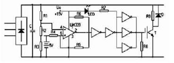 設UDC為電力電容C1 兩端的電壓,電壓比較電路直接檢測該電壓,與被測值超過設定允許值時,電壓比較器反轉, 觸發製動單元VB 導通,電力電容上的電荷經R 釋放,使電壓降低,反之,當該電壓低於設定允許值時,電壓比較器翻轉回原先狀態,輸出端為高電壓,經邏輯轉換後關斷UB 。由於比較器為OC 門輸出,該端電壓近乎電源電壓UC。