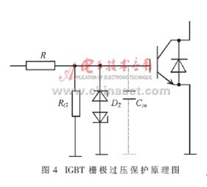 IGBT的驅動設計問題亦即MOSFET的驅動設計問題;設計時應注意以下幾點:①IGBT柵極耐壓一般在±20V左右,因此驅動電路輸出端要給柵極加電壓保護,通常的做法是在柵極並聯穩壓二極管或者電阻。前者的缺陷是將增加等效輸入電容Cin,從而影響開關速度,後者的缺陷是將減小輸入阻抗,增大驅動電流,使用時應根據需要取舍。圖4為IGBT柵極保護原理圖,其中,RG、DZ、Cin分別為等效柵極阻抗、穩壓管和等效輸入電容。②盡管IGBT所需驅動功率很小,但由於MOSFET存在輸入電容Cin,開關過程中需要對電容充放電,因此驅動電路的輸出電流應足夠大,這一點設計者往往忽略。假定開通驅動時,在上升時間tr內線性地對MOSFET輸入電容Cin充電,則驅動電流為