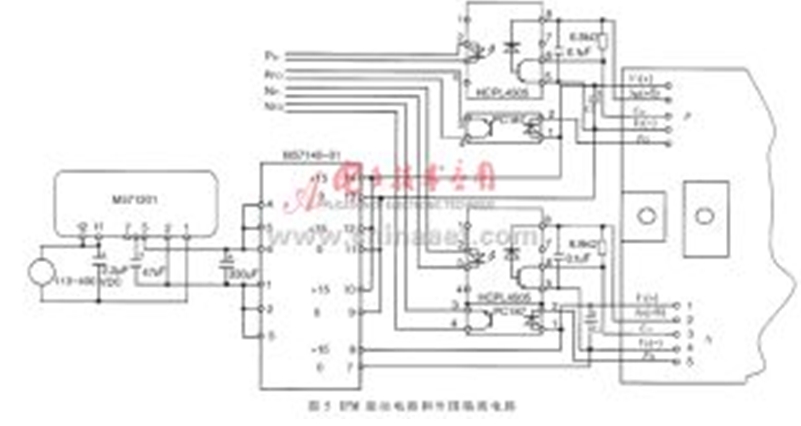 圖中各器件的類型和參數已經標出,其中,M57140-01和M57120L是三菱公司為其IPM係列產品專門配置的電壓變換模塊。在M57120L的輸入端加一路113V~400V的直流電壓可以在輸出端得到一路20V的直流電壓,在M57140-01的輸入端加一路18V~22V的直流電壓,輸出端可以得到4路相互隔離的15V電壓,方便地為IPM供電;HCPL4504和PC817是高速光耦,起到電氣隔離IPM與外部電路的作用,IPM的控製信號Cin和故障輸出信號FO通過光耦傳輸。
