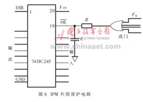 方案一 PWM接口電路前置74HC245、74HC244等帶控製端的三態收發器,如圖6所示。IPM的控製信號經過74HC245的輸入、74HC245的輸出後送至IPM接口電路;各個IPM的故障輸出信號經光耦隔離輸出後得到高電平FO,送入或門,或門輸出經過R-C低通濾波器後,送入74HC245的使能端/OE。IPM正常工作時,或門輸出為低電平,74HC245選通;IPM故障報警時,或門輸出為高電平,74HC245所有輸出置為高阻,封鎖各個IPM的控製信號,關斷IPM;實現了保護功能。