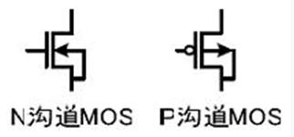 MOSFET管是FET的一種(另一種是JFET),可以被製造成增強型或耗盡型,P溝道或N溝道共4種類型,但實際應用的隻有增強型的N溝道MOS管和增強型的P溝道MOS管,所以通常提到NMOS,或者PMOS指的就是這兩種。右圖是這兩種MOS管的符號。