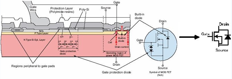 在MOS管原理圖上可以看到,漏極和源極之間有一個寄生二極管。這個叫體二極管,在驅動感性負載(如馬達),這個二極管很重要。順便說一句,體二極管隻在單個的MOS管中存在,在集成電路芯片內部通常是沒有的。下圖是MOS管的構造圖,通常的原理圖中都畫成右圖所示的樣子。 (柵極保護用二極管有時不畫)