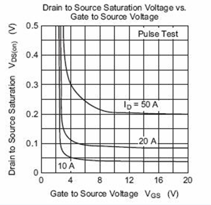 下圖是瑞薩2SK3418的Vgs電壓和Vds電壓的關係圖。可以看出小電流時,Vgs達到4V,DS間壓降已經很小,可以認為導通。