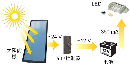 近年來,業界越來越關注利用可再生的清潔能源太陽能進行街道照明。典型太陽能街道照明係統由太陽能電池板、充電控製器、蓄電池、光源以及燈杆等組成,如圖1所示。而在照明光源方麵,經曆了從白熾燈到熒光燈和高強度氣體放電燈(HID)等三個重要階段,如此前熒光燈和HID均已被用於太陽能街燈。