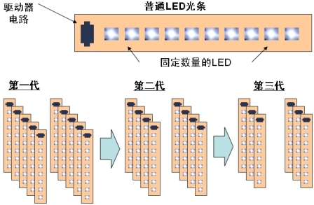 首先,在模塊化途徑替代金鹵燈光源方麵,可使每個LED光條采用固定數量的LED。隨著LED在光輸出等方麵性能的持續提升,要提供相同的總光能輸出,就可以使用更少的LED光條,從而降低需要使用的LED的成本,參見圖3。