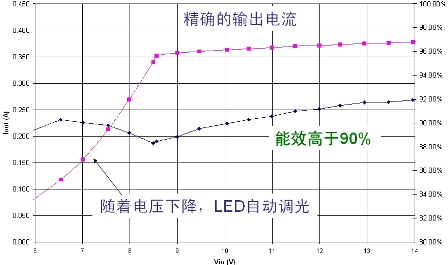 f圖4:NCP3066驅動8個CREE XRE LED時的輸出電流與輸入電壓曲線圖。