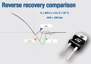 像STPSC806D和STPS1006D 這類碳化矽二極管給開關式電源(SMPS)設計人員帶來的另一個好處是,可以提高開關頻率,使其它元器件如濾波電容和電感變得更小,成本更低廉,功耗更低。