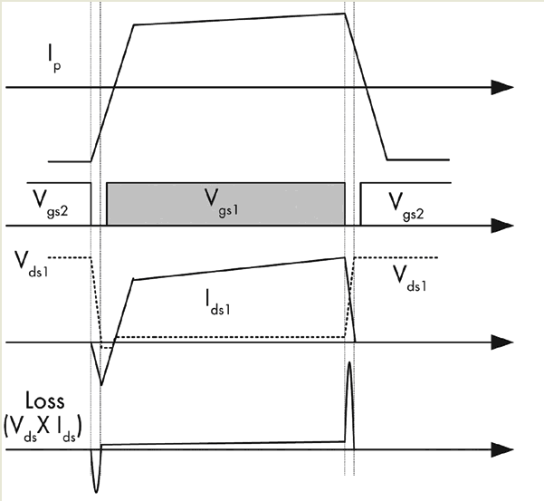 能量傳送網絡包含一個DC隔直電容和一個變壓器。這個網絡利用DC隔直電容 (CB) 消除方波電壓 (Vd) 的DC偏移,然後通過變壓器把純AC方波電壓傳送到次級端。由於存在泄漏電感,變壓器初級端電流Ip滯後於加在變壓器初級端上的電壓,這就讓MOSFET得以零電壓導通。如圖2所示,在其中一個開關斷開之後,Ip對MOSFET輸出電容進行充電 (或放電),最終開關電壓從一個輸入電軌變化到另一個 (從Vin到地或從地到Vin)。接著,Ip繼續流經反向並聯的體二極管。隻要體二極管導通,相應的MOSFET就能夠零電壓導通。這種軟開關方案不僅可降低開關損耗,還能減小電磁幹擾 (EMI)。