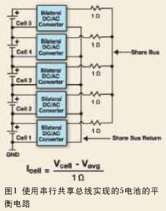 改善這種狀況的方法被稱為平衡。平衡是強製所有電池具有相同電壓的過程。這是通過平衡電路實現的。Aeroflex 平(ping)衡(heng)電(dian)路(lu)使(shi)用(yong)共(gong)享(xiang)總(zong)線(xian),這(zhe)個(ge)總(zong)線(xian)的(de)電(dian)壓(ya)等(deng)於(yu)所(suo)有(you)電(dian)池(chi)的(de)平(ping)均(jun)電(dian)壓(ya)。平(ping)衡(heng)電(dian)路(lu)由(you)那(na)些(xie)超(chao)過(guo)共(gong)享(xiang)總(zong)線(xian)電(dian)壓(ya)的(de)電(dian)池(chi)充(chong)電(dian)並(bing)將(jiang)電(dian)能(neng)注(zhu)入(ru)到(dao)電(dian)壓(ya)較(jiao)低(di)的(de)電(dian)池(chi),這(zhe)個(ge)工(gong)作(zuo)是(shi)通(tong)過(guo)高(gao)效(xiao)率(lv)的(de)雙(shuang)邊(bian)DC/AC轉換器來完成的。平衡電流的大小與電壓差成正比,也就是說,隨著電池越來越接近理想平衡狀態,平衡電流將趨近於0。圖1顯示了一個用於5個電池的平衡電路,其中,1 Ω電阻確定了傳輸比,也就是不平衡電壓與平衡電流的比值。對於容量較大(通常20Ah或更高)的電池而言,為了將達到平衡的時間減到最短,需要高達1A的平衡電流。對這些應用而言,雙DC/AC轉換器電路通過平麵變壓器工作在100kHz的頻率附近。