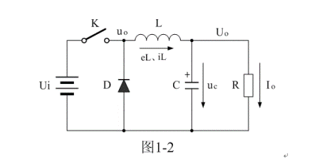 圖1-2是在圖1-1-a電路的基礎上,增加了一個整流二極管和一個LC濾波電路。其中L是儲能濾波電感,它的作用是在控製開關K接通期間Ton限製大電流通過,防止輸入電壓Ui直接加到負載R上,對負載R進行電壓衝擊,同時對流過電感的電流iL轉化成磁能進行能量存儲,然後在控製開關K關斷期間Toff把磁能轉化成電流iL繼續向負載R提供能量輸出;C是儲能濾波電容,它的作用是在控製開關K接通期間Ton把流過儲能電感L的部分電流轉化成電荷進行存儲,然後在控製開關K關斷期間Toff把電荷轉化成電流繼續向負載R提供能量輸出;D是整流二極管,主要功能是續流作用,故稱它為續流二極管,其作用是在控製開關關斷期間Toff,給儲能濾波電感L釋放能量提供電流通路。